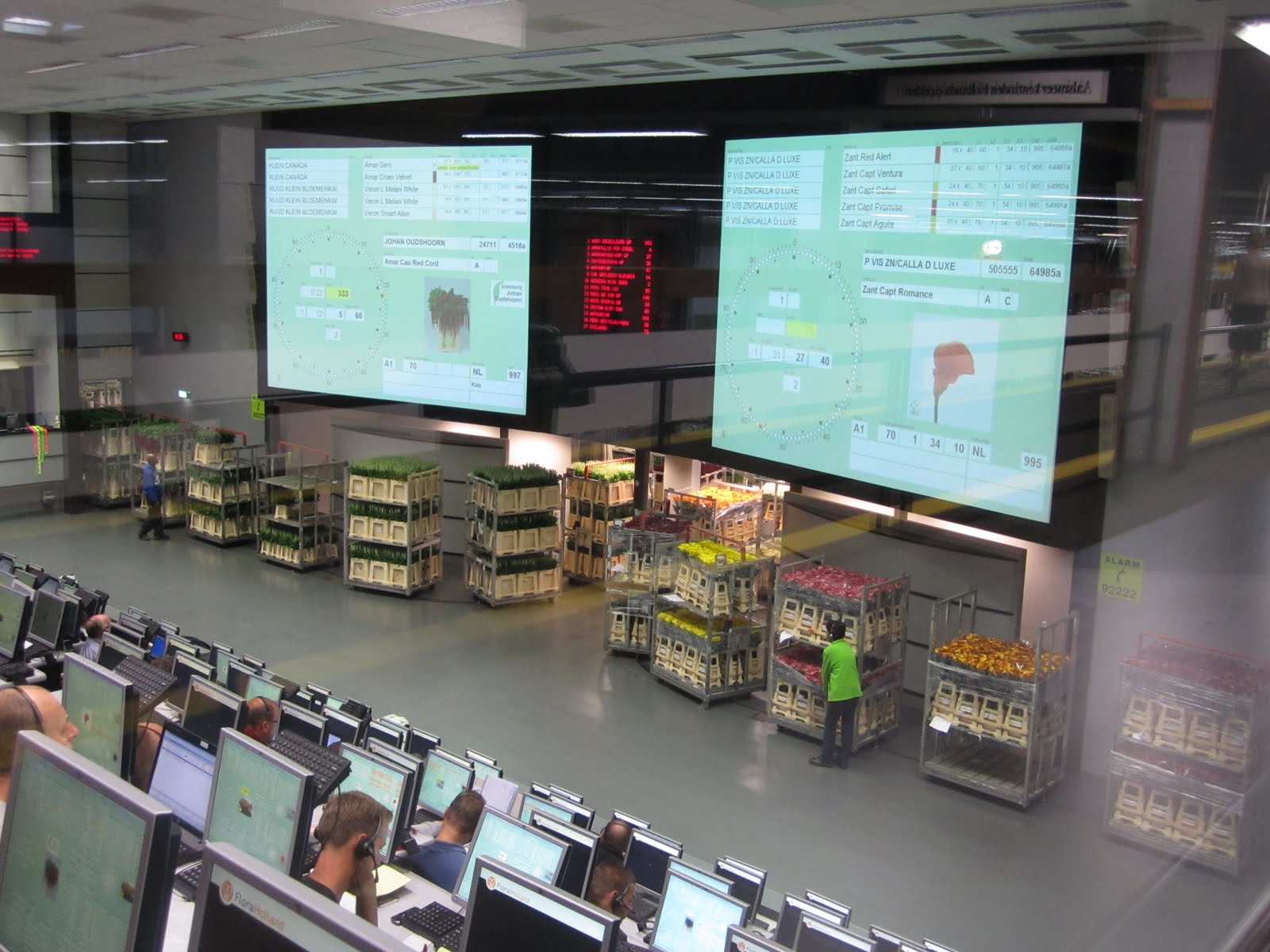 There were big rooms with tons of computers where people would make their bids. On the big screens in front you can see the flowers they were currently bidding on with the carts of the same flowers underneath. these carts move at about a slow walk's pace, so there isn't long to bid on the flowers.